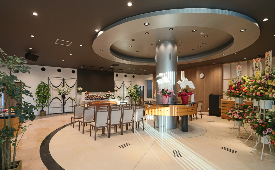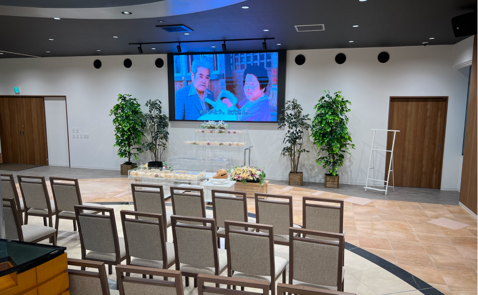 思い出の写真を映す大型モニターや会食場・宿泊個室・ご供養品サロンを備え、ご家族だけで温かくお別れいただけます。